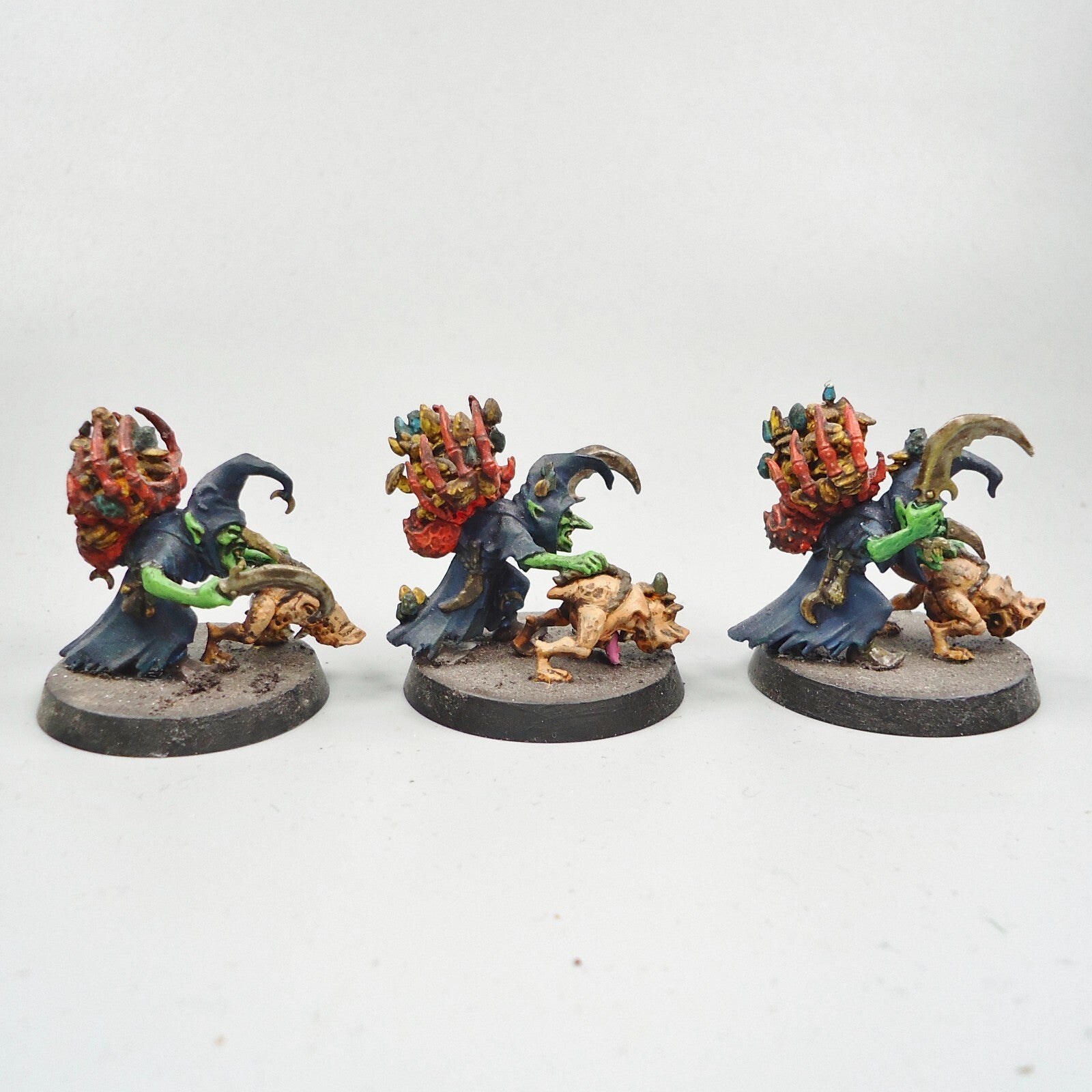 You are looking at a warhammer Fantasy Army Age of Sigmar Orc Orruk Gloomspite Gitz Sneaky Snufflers x3 painted (as seen in photo)